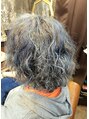 ブルーとホワイトのメッシュが必ず目を惹きます。白髪の割合は35%ぐらい。髪色に自由が効くのでしたら、ハイトーンカラーの方が絶対に白髪は目立ちません。ツイストスパイラルも最近人気。