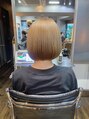 【気に入って頂いたスタイルは、ブックマークをしてご提示ください】アゴラインの前下がりボブ。丸みシルエットのボブに、ベージュブラウンが重く見えがちな硬い髪も柔らかく見えます。20代30代40代50代と幅広い年齢のお客様にご来店して頂いてます。
