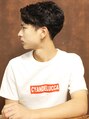 耳周り、襟足をスッキリ短くしたツーブロックショートスタイル。前髪は七三分けで上げて横に流せる様に、トップは高さが出る様に長めでレイヤーを入れ全体的に緩めにパーマをかけて立体感を出しています。