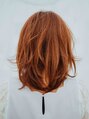 結べる長さの鎖骨レングスでレイヤーを入れてひし形シルエットに!!カラーは明るめのオレンジ系でツヤ感と軽さを出しています。前髪は薄めにして抜け感を◎レイヤーを短めに多めに入れているので動きがとても出るスタイルです!