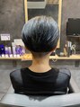 バックとサイドの中は6mmで刈り込んで、おさまりよくショートスタイルに仕上げています。カラーは、ブリーチのハイライトで抜き、上からオンカラーで濃いめのネイビーブルーを入れてアクセントを出しています。