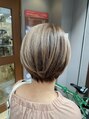 グレイカラーお客様です。伸びた白髪目立ちづらいグレージュで自然なハイライトのカラーをのせました。ピンクパープルのイヤリングカラーをアクセントにしました。