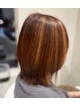 表面にレイヤーを入れることで、毛先に動きを出しやすします。アイロンで外ハネにも出来ます。白髪ぼかしのハイライトにオレンジでオンカラー