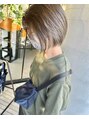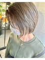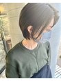 ほんのり前下がりのラインで切って今時な前下がりボブ*段は少しだけ入れて、形はシンプに。量はしっかりと減らして透け感を出すのでポイントです◎カラーは濃いめのオリーブカラーで赤味を消して、トレンド感のある雰囲気を創ってます。