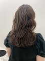 ロングヘアのウェーブ。耳周りから毛先までの動きが女性らしい柔らかさのある雰囲気に。前髪も横と馴染むぐらいのウェーブに仕上げてます。秋らしいブラウンカラーと相性よし。