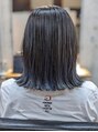 肩に沿うようにカットした切りっぱなし外ハネボブスタイルカラーは中間~毛先にブリーチをかけた後、ブルー系のカラーをオンカラーし、上はグレー→毛先にかけてブルーが強くなるグラデーションカラーに色落ちもキレイなデザインカラーです