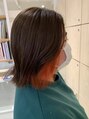 シアーベージュのカラーです!イヤリングカラー部分に濃いめのオレンジでフレッシュの印象に!ずっと人気の切りっぱなしボブで、アレンジしやすい長さです!