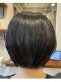 襟足はスッキリさせすぎず、首にそう感じで長さを残して、前下がりのショートボブ。毛先は束間がでるように軽さも出しています。
