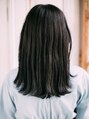 ミディアムレングスの韓国系スタイルです。薄めの前髪と毛先のパッツン感と顔まわりのレイヤーがポイントです。カラーはブリーチ後、ブルーブラックをオンカラーしています。まとまりとつや感にはトリートメントも必須です◎