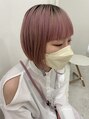 前にブリーチしたハイトーンを生かして淡いペールピンクにぱっつん前髪のバランスが可愛い。あごラインの前下がりボブで首元もすっきり(^-^)