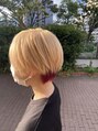 今回スタイルは襟足をすっきり目のショートボブ すた椅子です!全体的に明るめのブロンドカラーにして襟足だけ赤を入れメリハリのある感じのスタイルになりました!