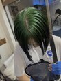 根本をブリーチしてグリーンに(^^)原色はブリーチ必須です☆パツッとなるようにカット(^_^)いつも持ってきてくれるスタイルがセンスがありすぎるお客様です(^_^)♪元々癖のある髪質なのでこの日は同時に縮毛矯正もあててます。ツヤツヤになりました(^_^)v
