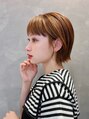 顎くらいの大人ショート、ミニボブ。オレンジベージュカラーで、透明感と柔らかい印象になれます。オイルバームを髪全体に馴染ませるだけのツヤ髪になれる簡単スタイリング。