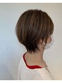 丸いフォルムと襟足の束感にこだわったショートヘア。カラーは明るいミルクティーカラーにハイライトをプラスして動きのあるヘアに仕上げています。