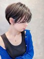 大人かっこいい×前下がりショート斜めに流せる前髪、首が綺麗にみえる襟足、前下がりのシルエットのショートです。カラーはオレンジ味を抑え透明感を出したアッシュ系カラーです。クリームワックスで簡単にスタイリングできます。
