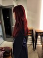 ワンレングスのロングヘアー。カラーとカラートリートメントでツヤツヤで発色のいいカラーリングに!秋服とボルドー相性いいですよ!