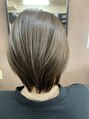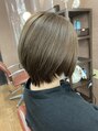 ショートボブスタイルにして後ろはスッキリめ、頭の形も綺麗に見えるよう意識して、スライドのみで質感と毛量調整して、ハンドブローでも収まりやすく持ちも長く保てる様に意識してます!カラーはプラチナグレージュ系で肌馴染みいい色味にしてあります!