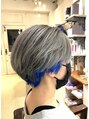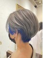 襟足スッキリ目のレイヤーボブでカットその後、一度ブリーチを行い、ミルクティーベースにシルバーをミックスしたカラーとフェイスフレーミングに青をアクセントに入れました