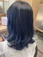 ネイビーブルーカラーでイメチェンヘア。ブリーチは2回がおすすめ!ブリーチ履歴ありの方はオンカラーのみでも◎直毛の方はデジタルパーマを。