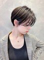 大人かっこいい×前下がりショート斜めに流せる前髪、首が綺麗にみえる襟足、前下がりのシルエットのショートです。カラーはオレンジ味を抑え透明感を出したアッシュ系カラーです。クリームワックスで簡単にスタイリングできます。