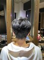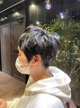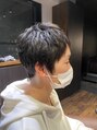 前髪を眉上の設定でアシメっぽく左流しで毛先にギザギザ感がでるようにカットしています。後ろは後頭部の丸みがでるように襟足をしめる。