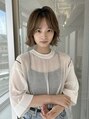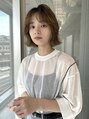 前髪長めのレイヤーボブシースルーバングで野暮ったさを無くし、軽さと柔らかさのある大人な雰囲気のボブです。髪色は、ブラウンベージュで艶感と透明感のあるカラーです。