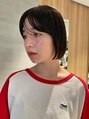 あごラインの長さでぷつっとボブにカット。前髪は目に少しかかる長さで、ワイドにカットし、スタイリングでシースルーにします。カラーリングは地毛に近い6トーンの赤みを抑えたカラー剤で染めます。