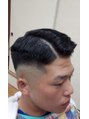 標準な高さのスキンフェードで左7:3ラインを入れた、バーバースタイル