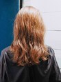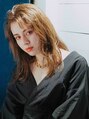 前髪は、ぎりぎり目にかかるくらいで設定しているのでおろしのスタイルも、センターパートなどの、あげたスタイルもどちらも楽しめる長さになっています。全体的に柔らかいベージュに仕上げることでロングスタイル特有の重さをなくしたスタイルです。