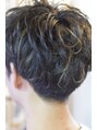 ツーブロック、刈り上げのマッシュレイヤースタイル。パーマヘアを生かしつつ、全体にメッシュを入れて軽やかな雰囲気に。
