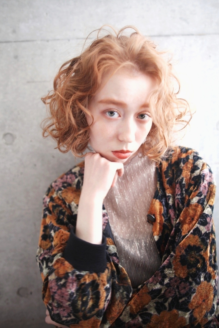 【STYLE】 ワンレンボブベースにカットを表面にレイヤーを入れました。 トップは根元に立ち上がりが付く様にと表面と顔周りにはくびれを作る様に緩くパーマをかけています。 オレンジカラーが映える様に髪に柔らかな動きを作りました。