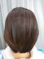 根元4センチのリタッチ縮毛矯正。カットは毛先4センチのグラデーションカット。細毛で量が多いので襟足、毛先少し量感減らします。