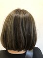 モード系。カットは前下がりグラデーションボブです。カラーでは、ハイライトで立体感を出し、その後、イルミナカラーでグリーンアッシュに染めてます。