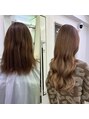 全体をブリーチし、ブラウンベージュを入れたカラーになります。シールエクステを70本付けて色落ちの事を考えて、グラデーションカラー風に明るいエクステを付けて仕上げています。