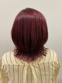 ボブウルフ♪矯正をかけているお客様なのでブリーチはNG、、そのためカラー剤の1番明るいもので全体トーンを上げたあとに赤寄りのピンクカラーをオン!!推し活にもgood!前髪を短めでキュート感upです♪触角は短めに頬骨をカバー◎