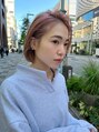ワンブリーチでピンクパープルを乗せた柔らかい印象のヘアカラー。色落ちも不自然にはならない淡い仕上がり。片側の耳にかけてタイトなパートとボリュームのあるパートで見た目の変化をつけています。