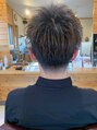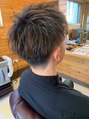 サイドは3mmで刈り上げ、そから繋がるようにバックはハサミで刈り上げました。トップ、ハチ回りセイムレイヤーカットしセニングで質感調整しました。
