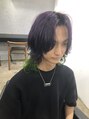 全体を濃い紫で襟足を黄緑、髪型を前髪長めのアップバングウルフスタイルです!