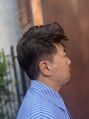 大人男性のカジュアルなスタイル。サイドバックは刈り過ぎない刈り上げ、トップは長めにレイヤーを入れ、スライドカットで毛流れを作り、前髪はあえて少し前下がりにカットして作り、下ろしても分けてもいい感じのスタイルです。