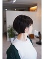 ショートからボブにしていく途中のミニボブ状態です。耳にかけすっきりみせるようにしています。耳にかける場合は、サイドや耳後ろの毛量調整がポイント。また前髪の切り方がポイントで、自然にサイドに繋がるように、切っています。