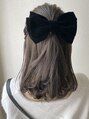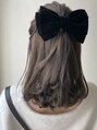 ミディアムボブのハーフアップ☆ベロアリボンにインパクトがあるので毛先のみミックスでゆる巻き&トップの引き出しも控えめに◎
