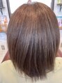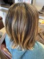 オンカラースタイル。 表面には、ぎらつきが出ないように細めに。。ランダムに太さの違うウィービングを施して、毛先に向かって明るさがグラデーションのように見えるようにしました。 上から落ち着いたモノトーン系のカラーを被せています。