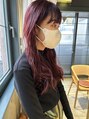 地毛から全体を1回ブリーチして、赤みをしっかり感じるピンクレッドに深みが増すラベンダー系の色味をオンカラー。発色ははっきりしてるけど、上品な深みのあるカラーに**