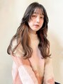 胸下ロングにフェイスレイヤーをプラスしたクアンクヘア。32.38ミリの太めのコテで無造作に巻くのがおすすめのスタイル。イヤリングカラーは柔らかいピンクベージュカラー。ブリーチ1~2回必須のカラーとなります。