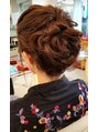 毛束を2つに分け取り、束ねた毛束にねじりこんだカールをつけていくデザインです。