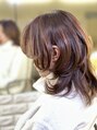 前髪長めのマッシュウルフ重めのポイントで大人仕様のマッシュウルフへ。トップだけカールをつけてアンダーは自然なカールでラフにUTAUメロウバームで毛先に毛束を作り立体的に