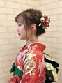 華やかな赤のお着物に合わせて和のヘア飾りで統一。