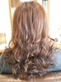 中間部からのリッジのあるウェーブです。毛先部分がブリーチ状態で色が抜けていたので負担が少ない低アルカリカラーで色味を合わせて全体の髪色を合わせました。