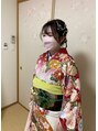 肩くらいのボブヘアでしたが、結べる長さでしたので、ポニーテールベースのアップスタイルに。帯締めも花形にし、四つ葉風に可愛く仕上げました。