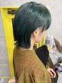 サイドをぱつっと切り揃えて襟足を残した、モードなミニウルフヘアです。カラーはケアブリーチでダメージケアしながらビビットなグリーンヘアにしてます。※髪質により1~2回ほどのブリーチが必要です。